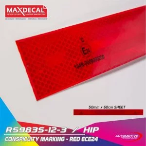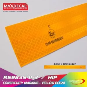 Stiker reflektor CONSPICUITY merk MAX DECAL. Sudah terdapat logo ECE (E mark) dan R104 pada stikernya. Selain itu ujung atas bawah stiker ini juga sudah dilengkapi dengan edge-sealing technology sehingga meminimalisir debu dan air meresap masuk ke dalam reflektor. Sudah lulus uji standarisasi KIR dishub.